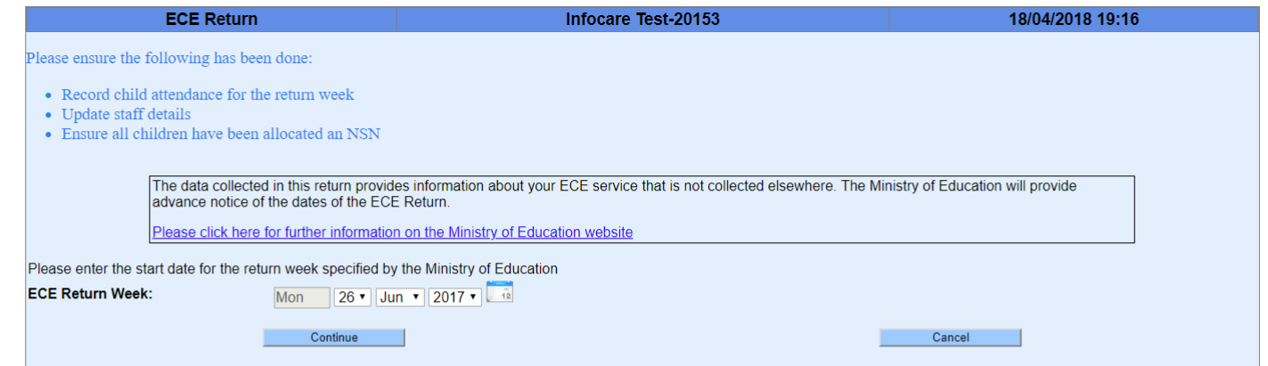 1. Go to the "ECE Return" screen by going to the "Reports" link in the menu bar, going to "MoE Reports" and then selecting "ECE Return (census)"