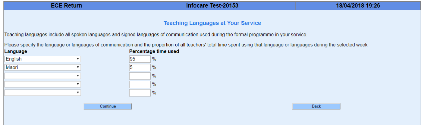 7. Read the instructions for completing the next screen in relation to languges used in your centre
