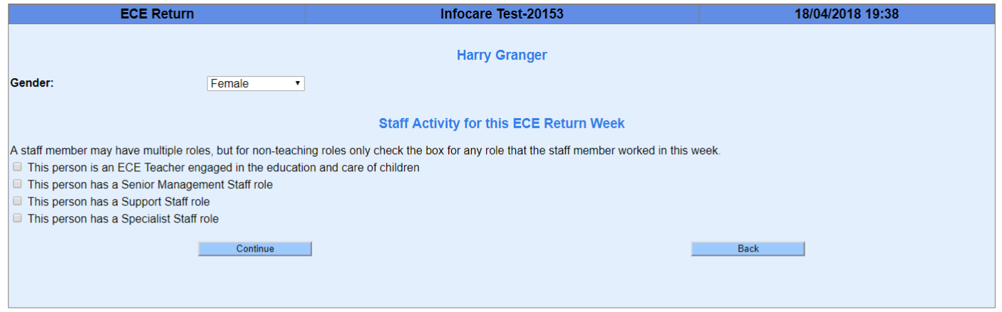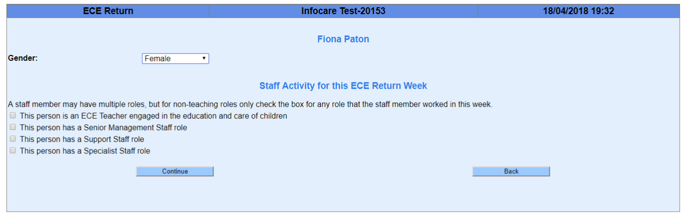9. The next screen that displays is about the staff that worked in your centre that week, their qualifications and contact times. Work through each staff member completing the information required