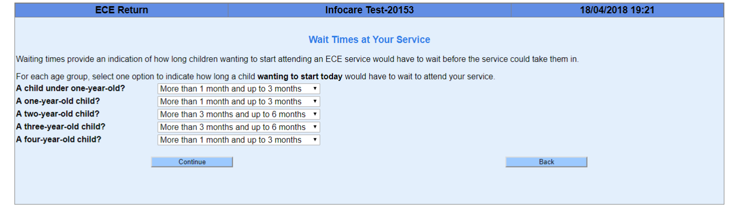 5. Read the instructions for completing the next screen in relation to waiting list times for children secting the options relevant for your centre