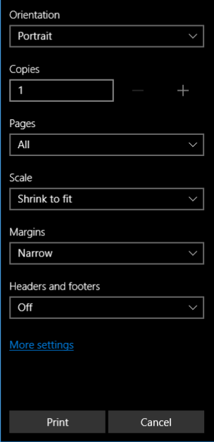 2. Select the "Scale" as "Shrink to fit", "Margins" as "Narrow" and "Headers and footers" as "Off"