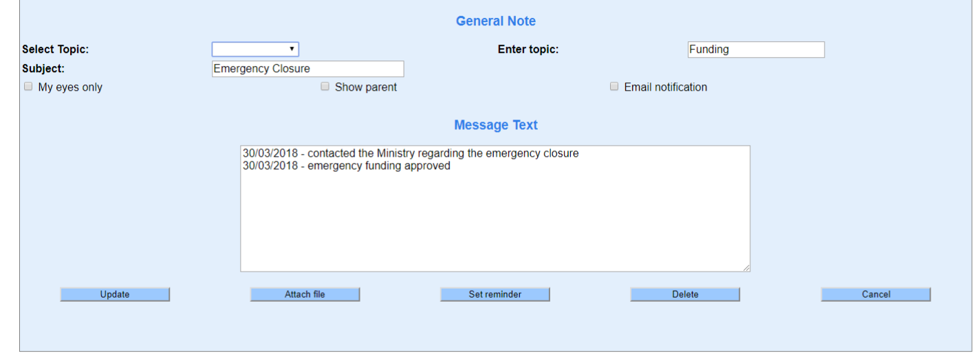 2. Select either the "General Notes", "Child Notes" or "Staff Notes" radio button of the note you would like to delete